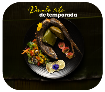 Nuestro Pescado Frito de Temporada es un clásico de la cocina colombiana, preparado con pescado fresco, frito hasta alcanzar una textura crujiente por fuera y jugosa por dentro. Se acompaña de bollo de yuca, limón parrillado que realza su sabor, y una fresca ensaladilla caribeña con encurtido, que aporta un contraste perfecto de texturas y aromas.