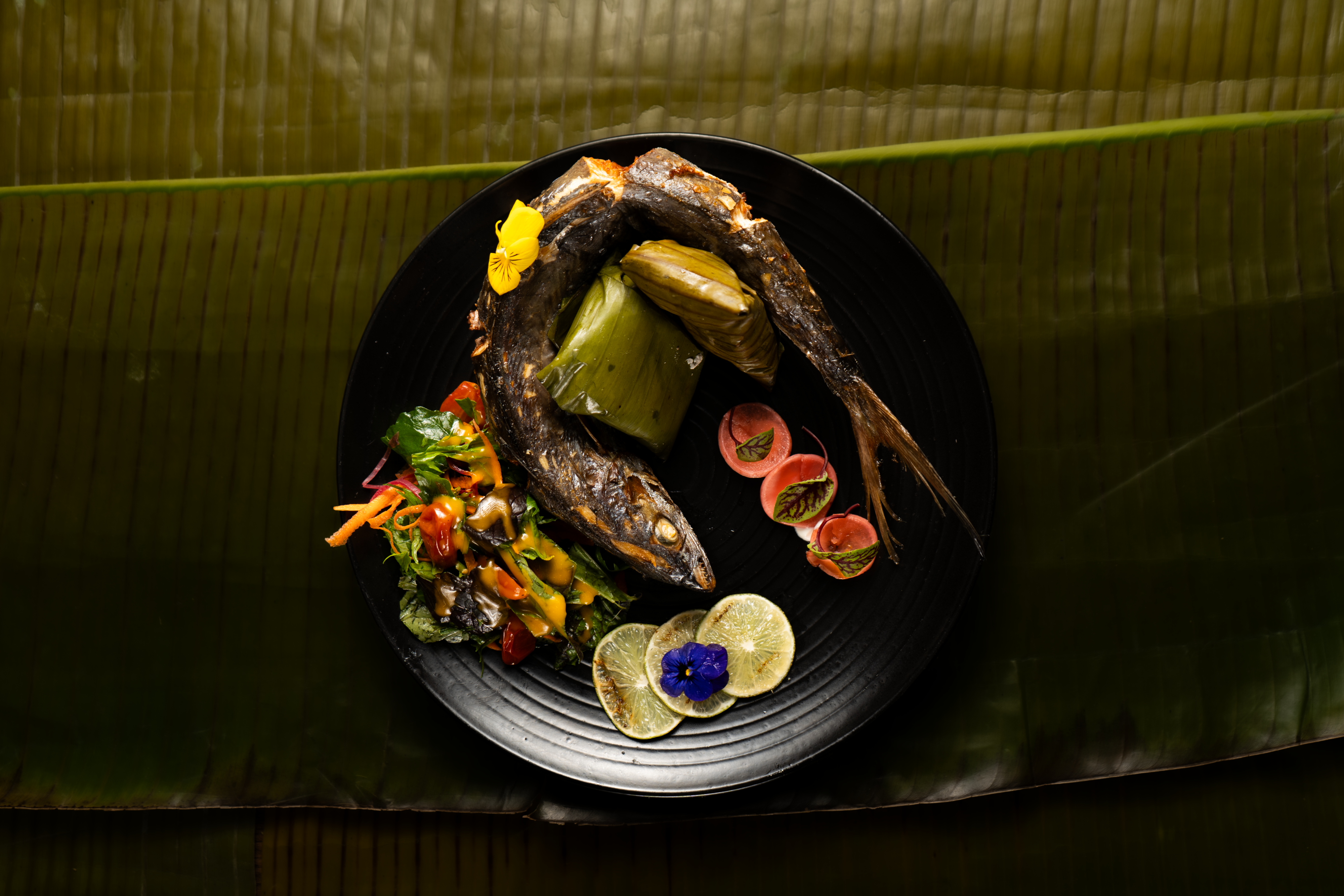 Acompañada de bollo e yuca, limón parrillado y ensaladilla caribeña con encurtido.
