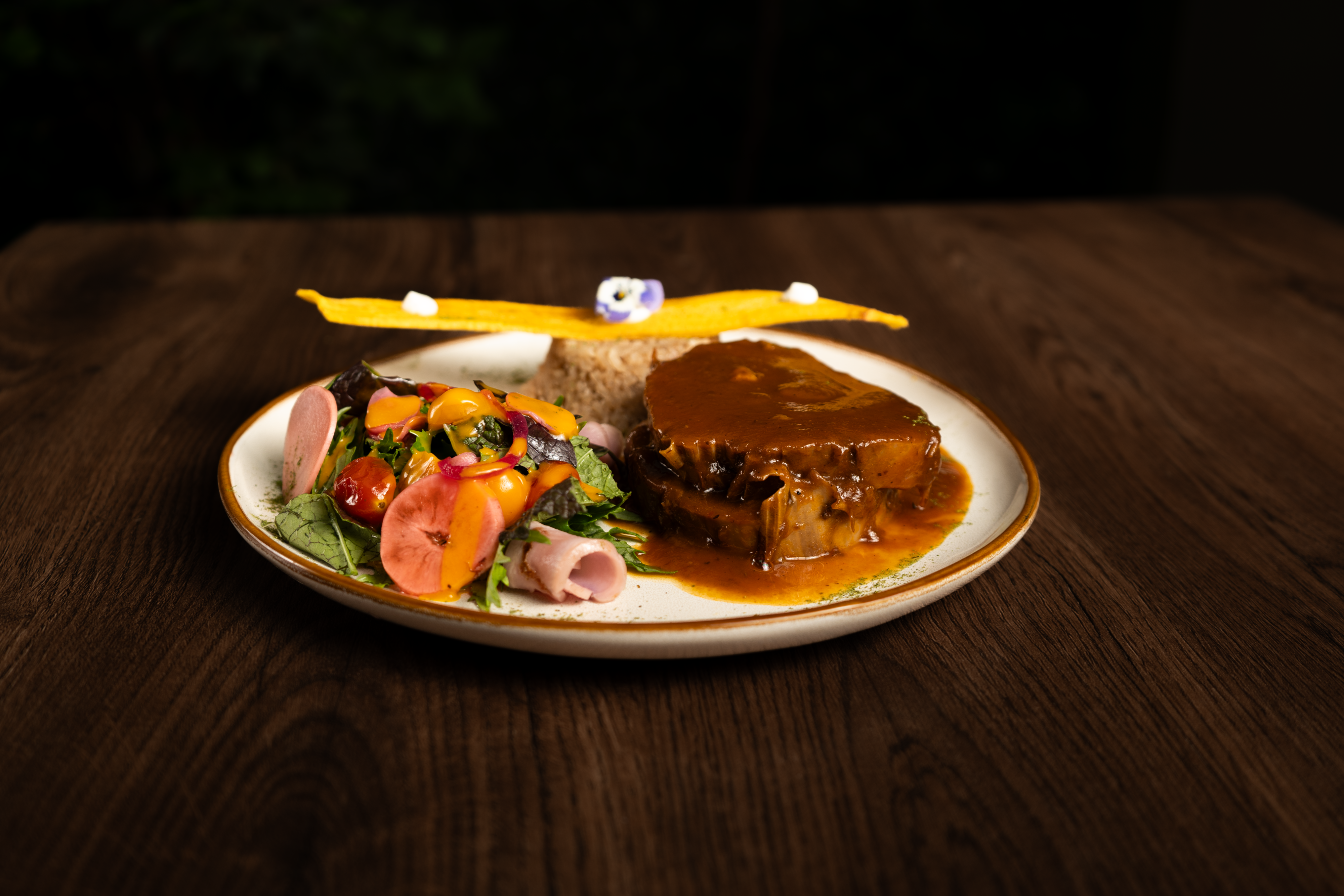 Suave y jugosa posta de muchacho, preparada en sus propios jugos mediante técnica de cocción lenta, bañada en una deliciosa salsa ligeramente agridulce a base de tamarindo, panela y vegetales. Acompañada de arroz blanco o titoté, chips de plátano y ensaladilla.